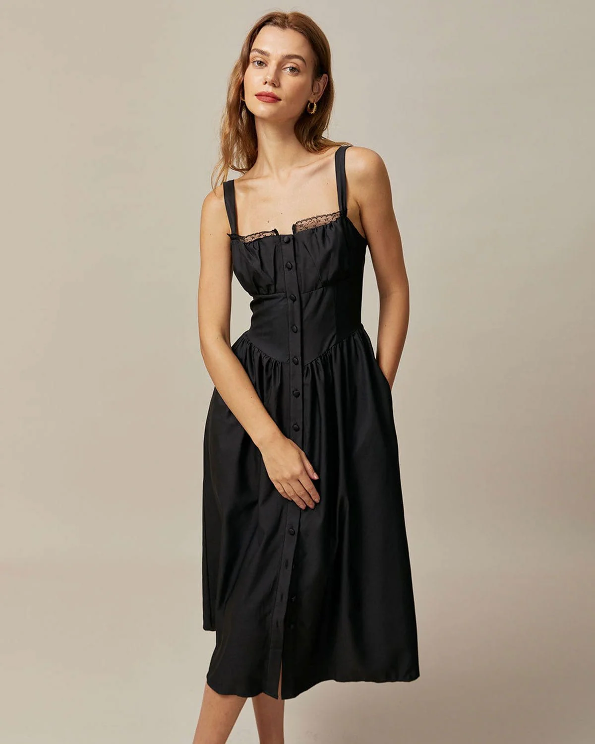 The Black Square Neck Lace Cami Midi Dress