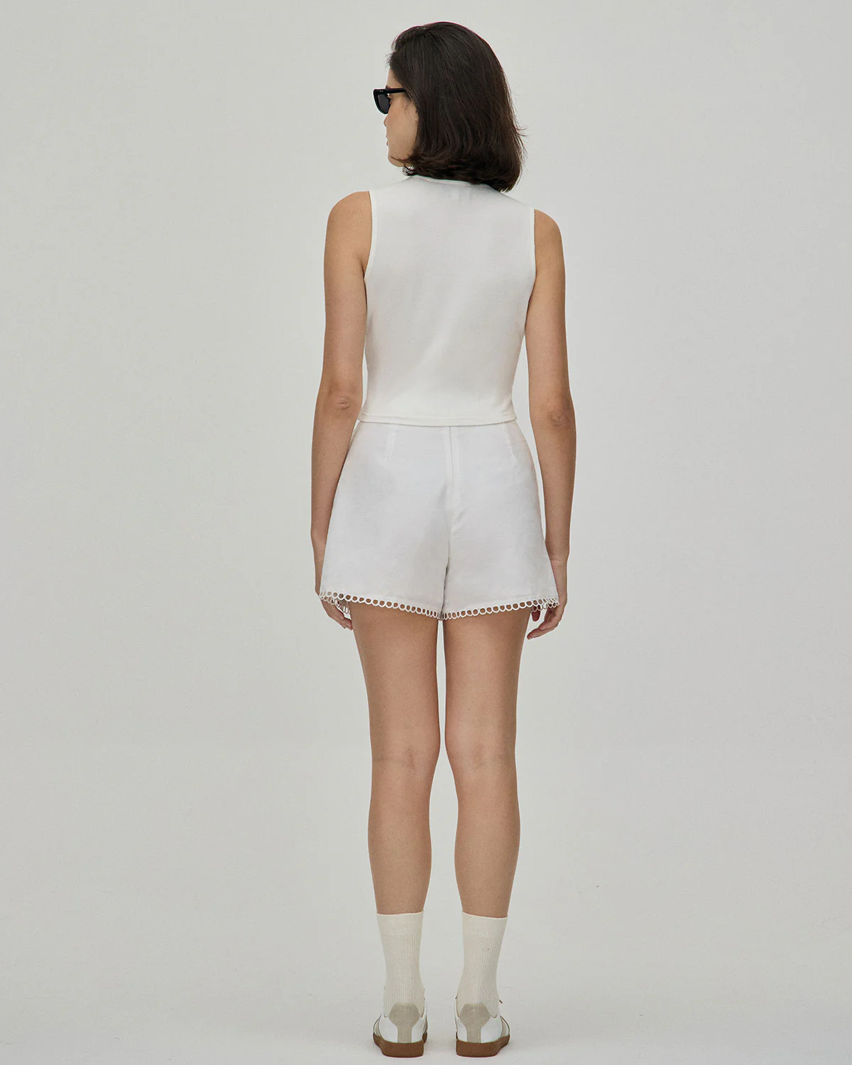 Impeccably tailored with a high-waisted silhouette, these wide-leg shorts offer both comfort and style. The high-rise design cinches at the waist, accentuating your natural curves and creating a flattering hourglass shape. Perfect for elongating the legs, these shorts are versatile enough to transition seamlessly from day to night. Adorned with intricate lace trim detailing, these shorts add a touch of romance to any ensemble.